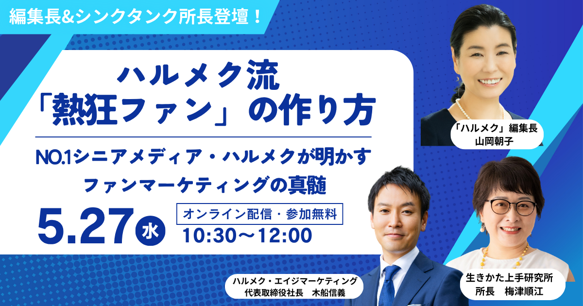 ◆シニア女性の消費のいま 1.ハルメク編集長が解説!「熱狂ファン」の作り方 2. 【大手企業多数】ハルメクを活用したファンコミュニティの展開事例 3. ハルメクのファンマーケティングの根幹を支えるインサイト活用 |